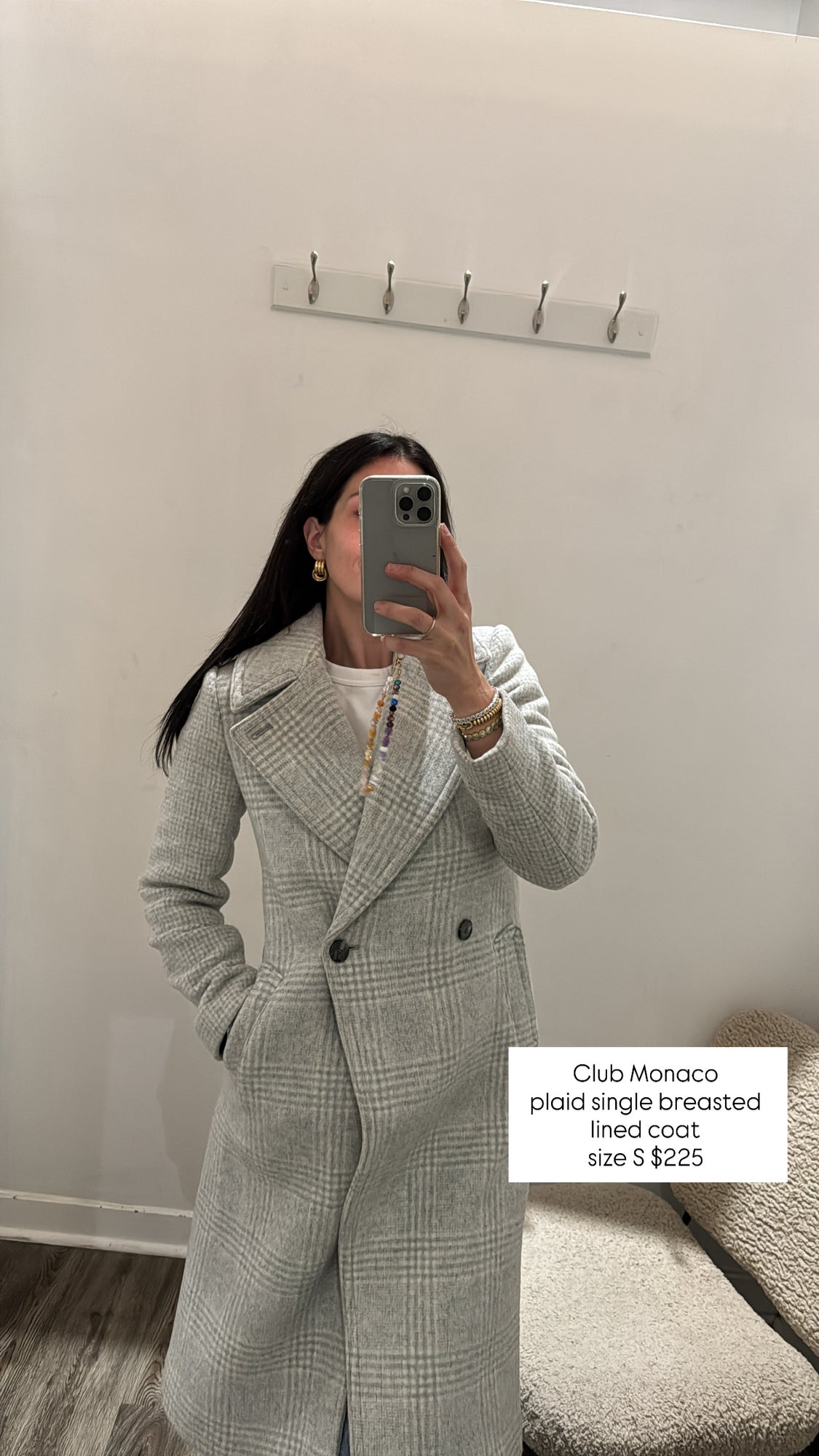 Wool blend long line single breasted coat, lined. Excellent condition! Grey, white, blue.