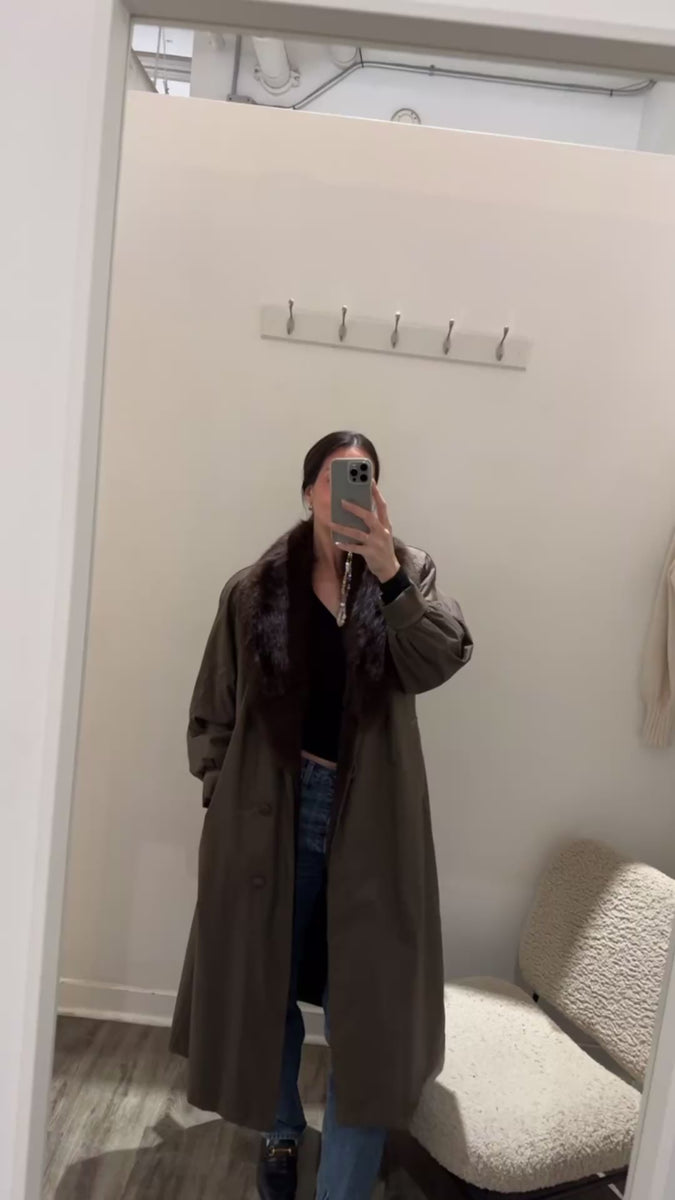 Excellent vintage condition nylon belted trench coat with removable inner fur lining and fur collar. Embroidered design on sleeves.