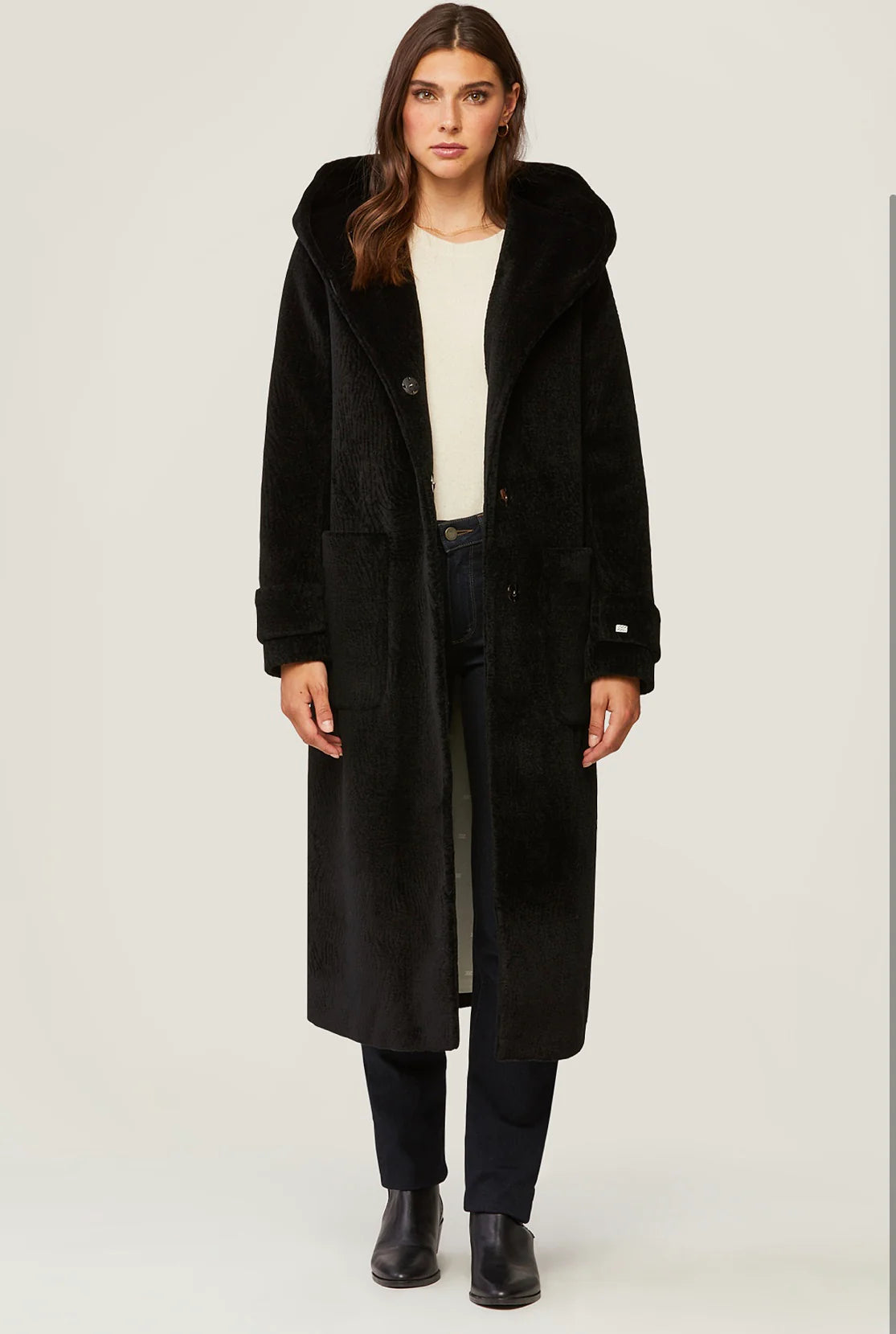 New with tags faux fur hooded coat. Button closure. Fits up to small.