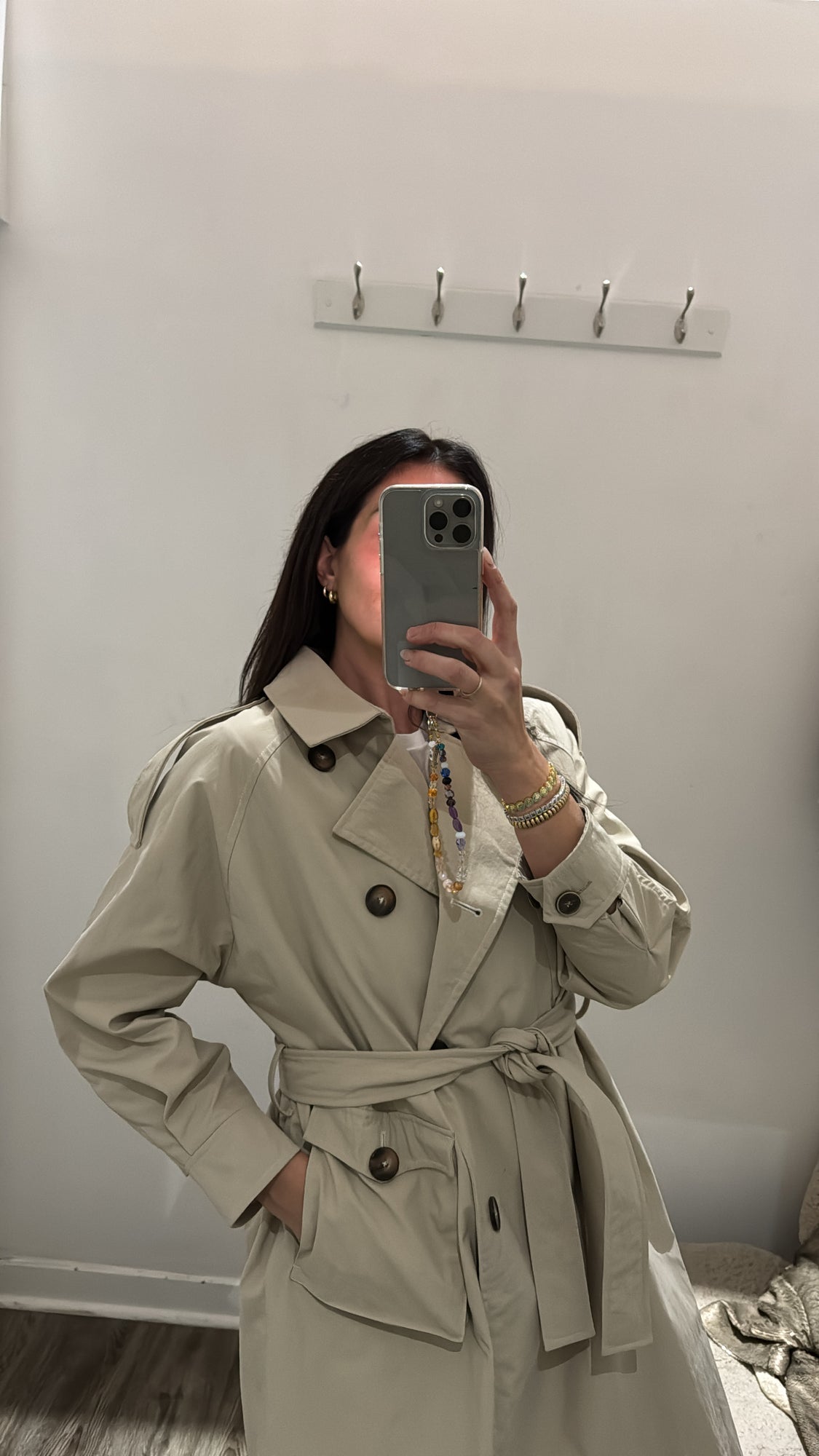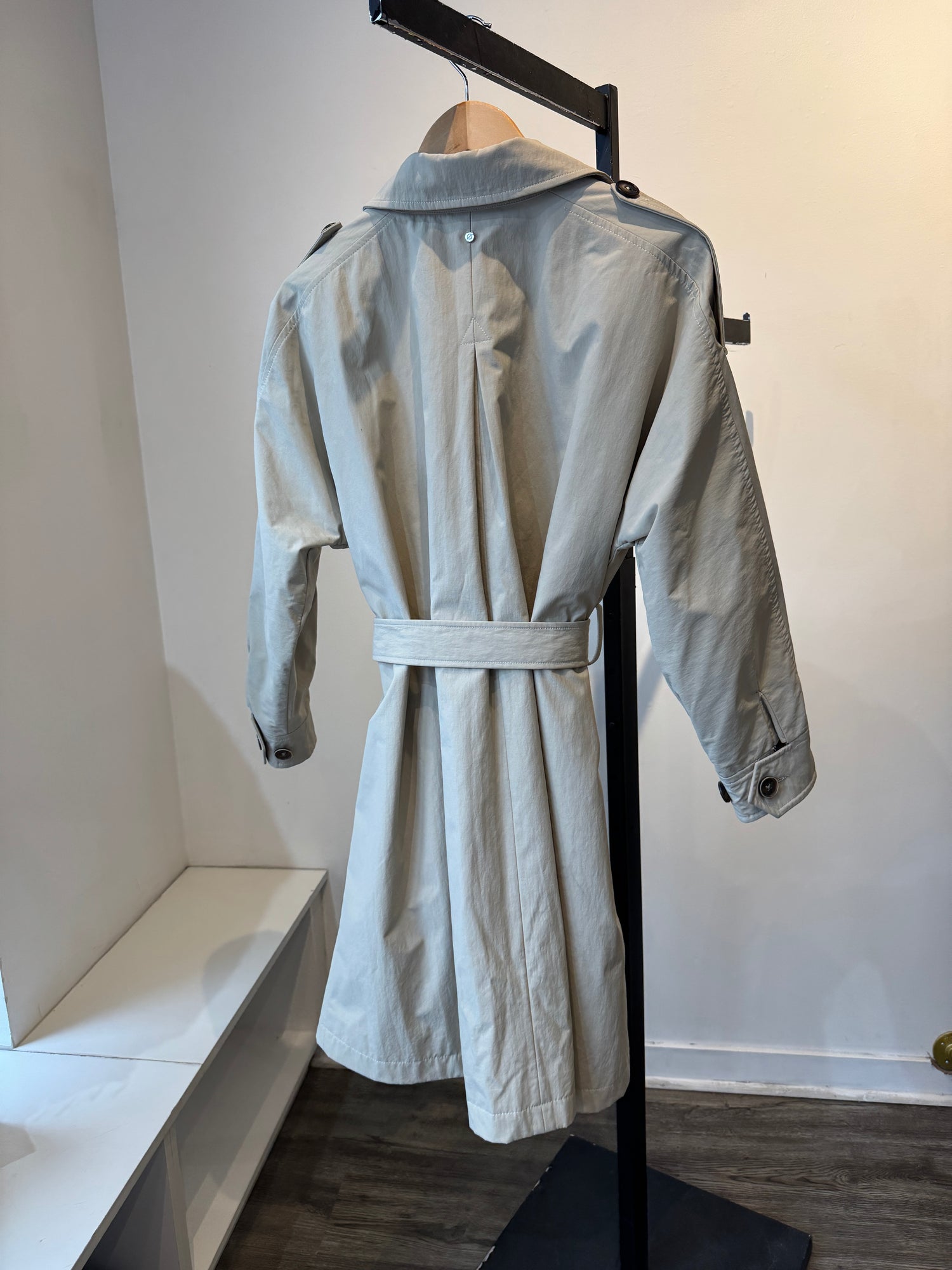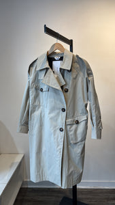 100% polyester. Dry clean only. Up to 4-button closure with belt around waist. Excellent preloved condition, small marking on backside of jacket.