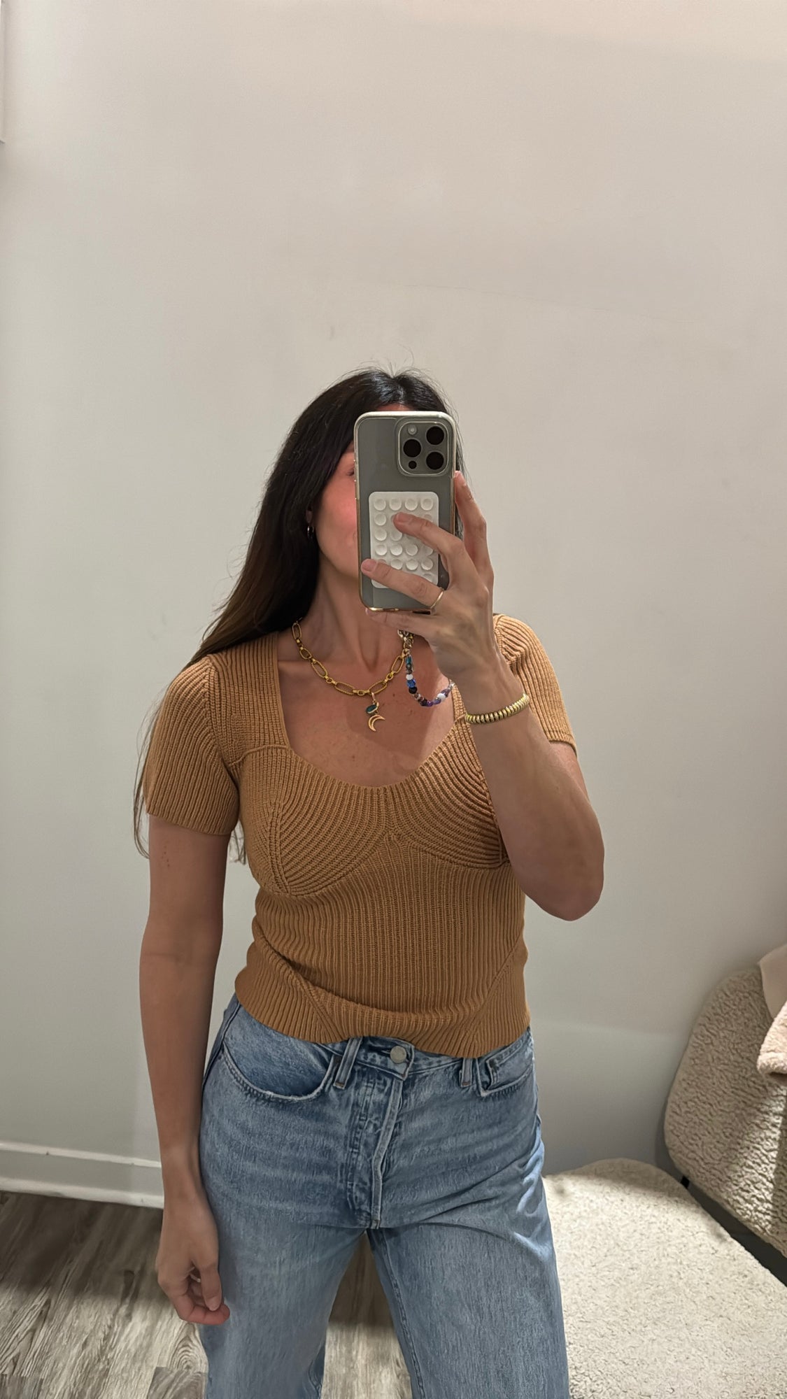 Excellent like new condition. Camel colour. This fitted piece features a distinctive bustier-inspired sweetheart neckline and is crafted from a stretch rib-knit fabric.