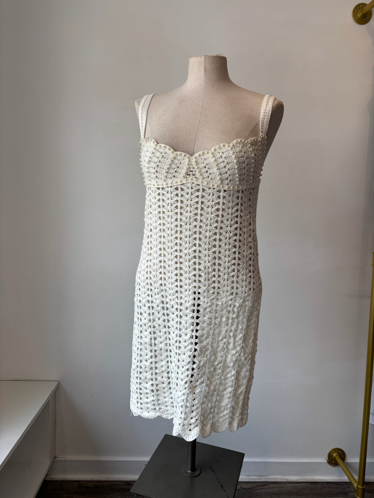 Unmarked white crochet mini dress with pearls detail, size Medium