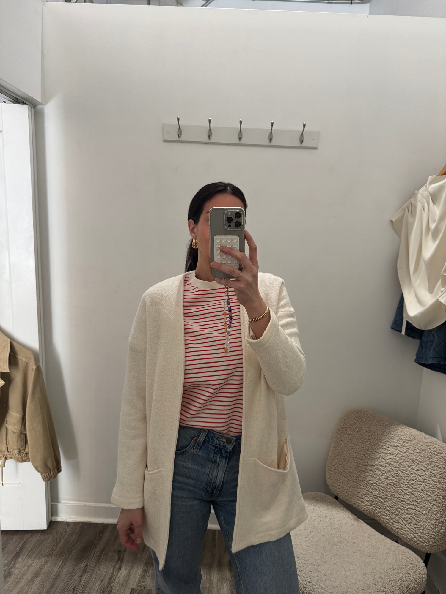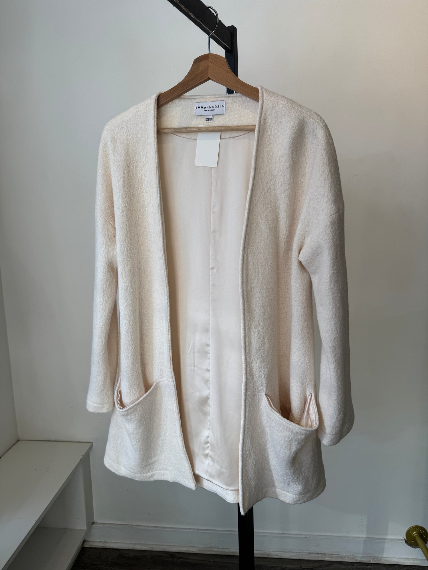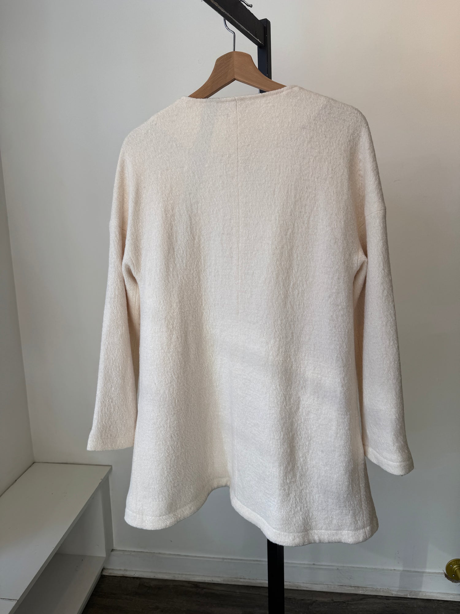 Excellent like new condition. Satin lined textured cardigan/jacket. Two front pockets. Slight oversized fit. Wool blend.