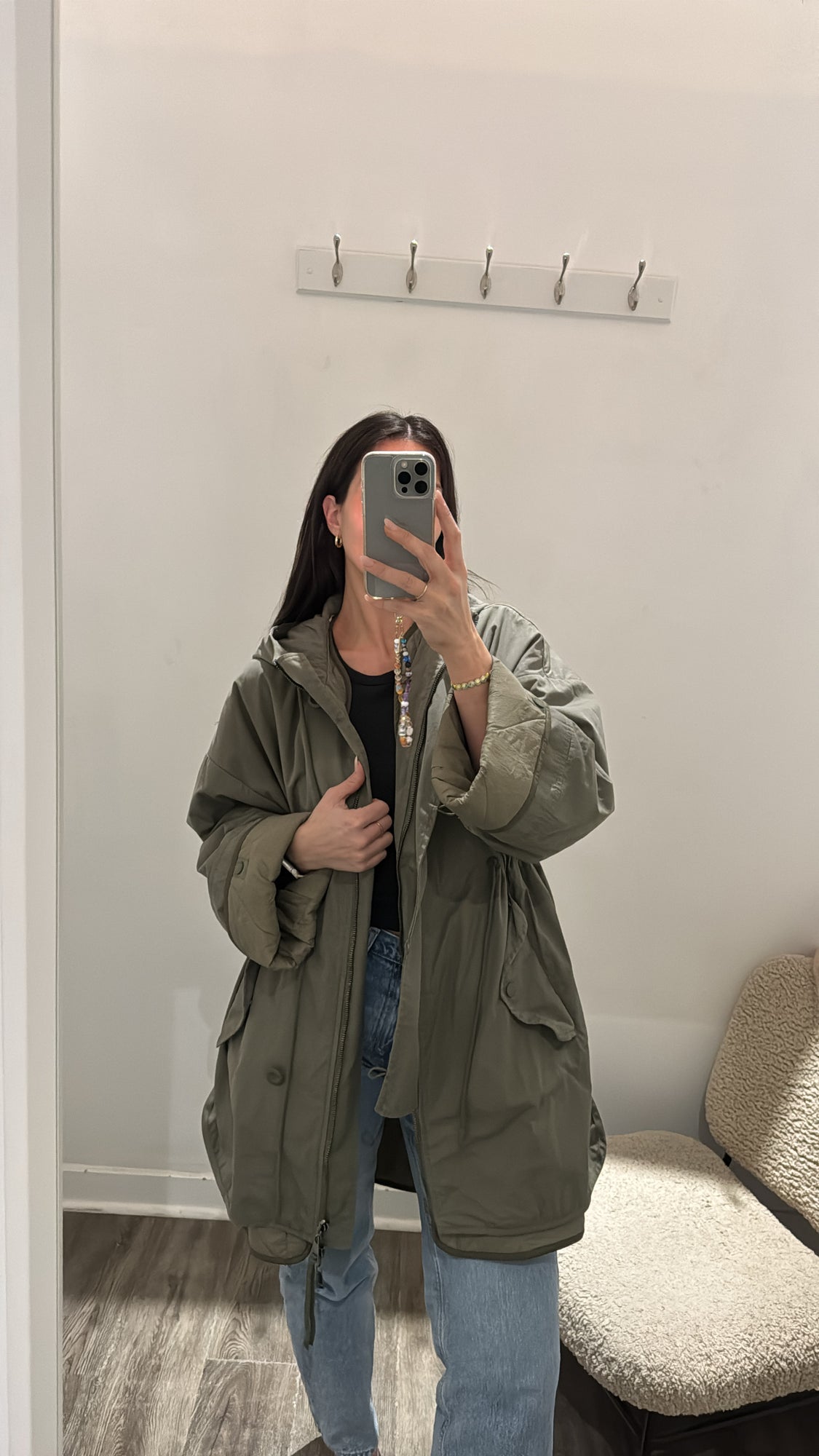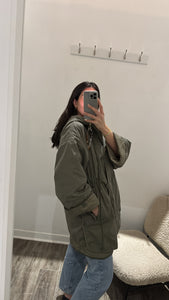 Padded coat with removable interior quilted lightweight jacket. Drawstring waistband. Zipper and button closure.