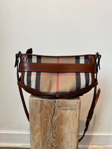 Good condition leather + canvas bridle crossbody bag. Some scratches on leather straps, sides and at bottom of bag.