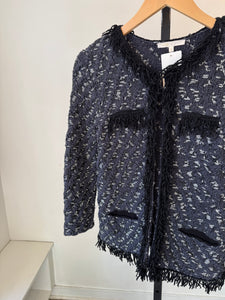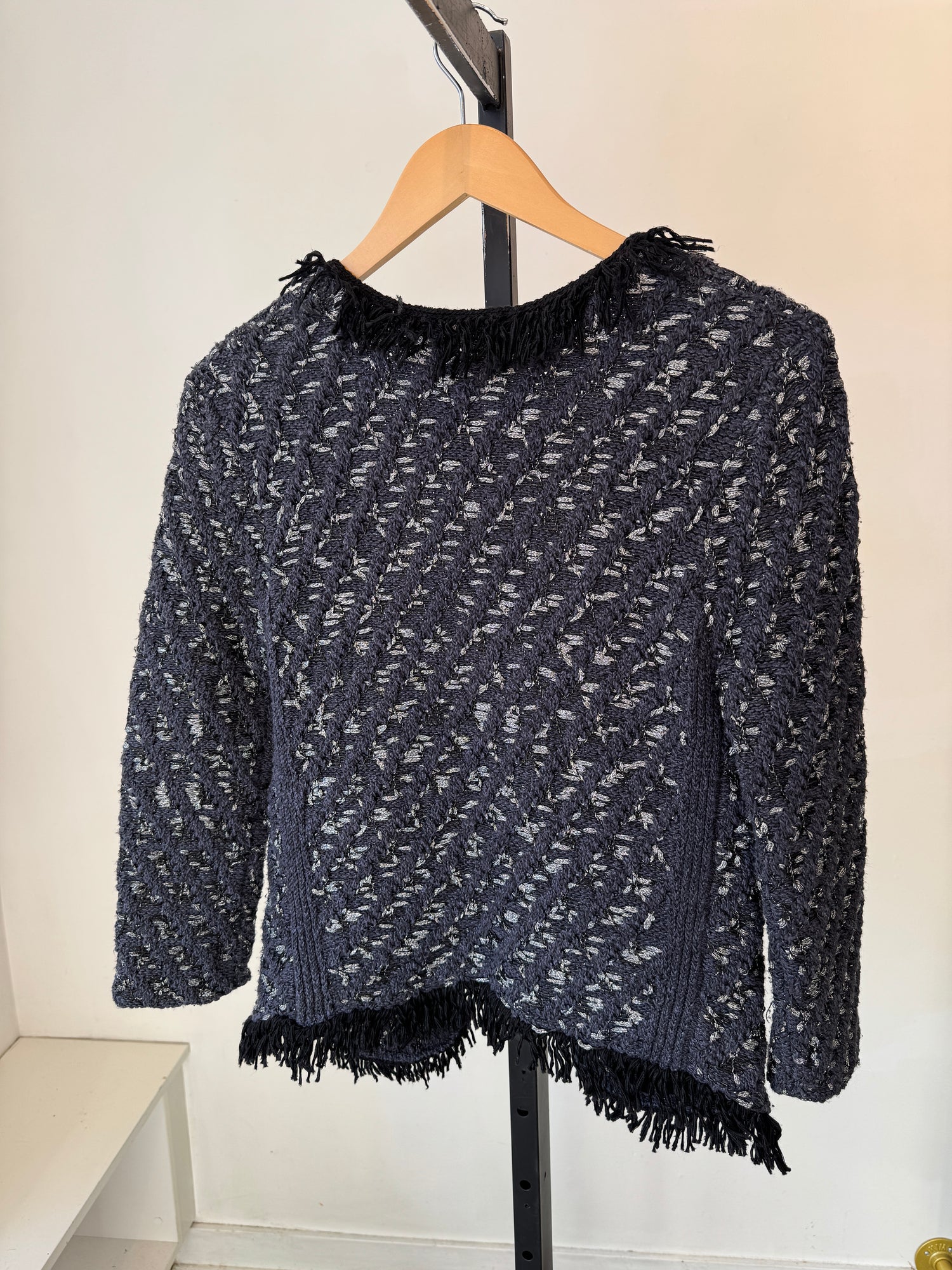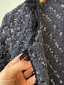 Excellent condition. Navy with black fringe and metallic threading throughout. Has one loop closure. Size 1, fits up to size small.